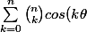\theta\\<br />=&\displaystyle 1+\sum_{k=1}^n{n\choose k-1}\cos k\theta+\sum_{k=1}^n{n\choose k}\cos k\theta+\cos(n+1)\theta\\<br />=&\displaystyle \sum_{k=1}^{\fbox{n+1}}{n\choose k-1}\cos k\theta+\sum_{k=\fbox{0}}^n{n\choose k}\cos k\theta\\<br />=&\displaystyle \sum_{k=0}^{n}{n\choose k}\cos (k+1)\theta+\sum_{k=0}^n{n\choose k}\cos k\theta\\<br />=&\displaystyle \sum_{k=0}^{n}{n\choose k}\left[\cos(k+1)\theta+\cos k\theta\right]\\<br />=&\displaystyle \sum_{k=0}^{n}{n\choose k}2\cos\left(k+\frac{1}{2}\right)\theta\cos\frac{\theta}{2}\\<br />=&\displaystyle \sum_{k=0}^{n}{n\choose k}2\left(\cos k\theta\cos\frac{\theta}{2}-\sin k\theta\sin\frac{\theta}{2}\right)\cos\frac{\theta}{2}\\<br />=&\displaystyle 2\cos\frac{\theta}{2}\cos\frac{\theta}{2}\sum_{k=0}^n{n\choose k}\cos k\theta-2\cos\frac{\theta}{2}\sin\frac{\theta}{2}\sum_{k=0}^n{n\choose k}\sin k\theta\\<br />=&\displaystyle 2\cos\frac{\theta}{2}\cos\frac{\theta}{2}2^n\cos\frac{n\theta}{2}\cos^n\frac{\theta}{2}-2\cos\frac{\theta}{2}\sin\frac{\theta}{2}2^n\sin\frac{n\theta}{2}\cos^n\frac{\theta}{2}\\<br />=&\displaystyle 2^{n+1}\left(\cos\frac{\theta}{2}\cos\frac{n\theta}{2}-\sin\frac{\theta}{2}\sin\frac{n\theta}{2}\right)\cos^{n+1}\frac{\theta}{2}\\<br />=&\displaystyle 2^{n+1}\cos\frac{(n+1)\theta}{2}\cos^{n+1}\frac{\theta}{2}\\<br />\end{array})