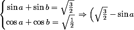 enfin : sin b = racine(3/2) - sin a = racine(3/2) - (racine6 +- racine2)/4 et on en tire b.